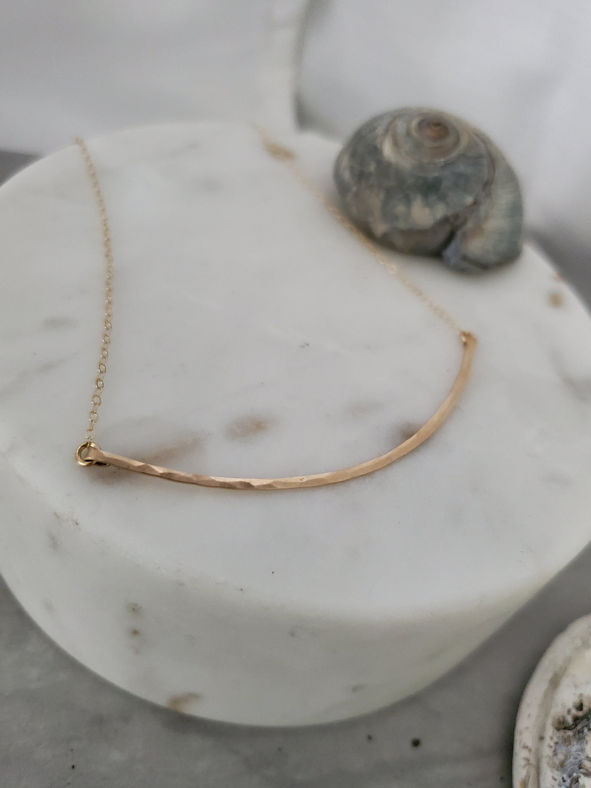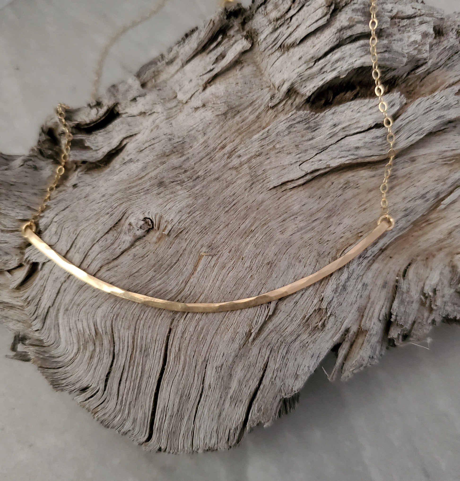 This large curved hammered bar necklace can dress up any outfit. The large pendant is made from thick, high quality, gold filled wire hammered into a 3" semi circle. It hangs from a delicate but strong gold filled chain. Shown here in 19" length.