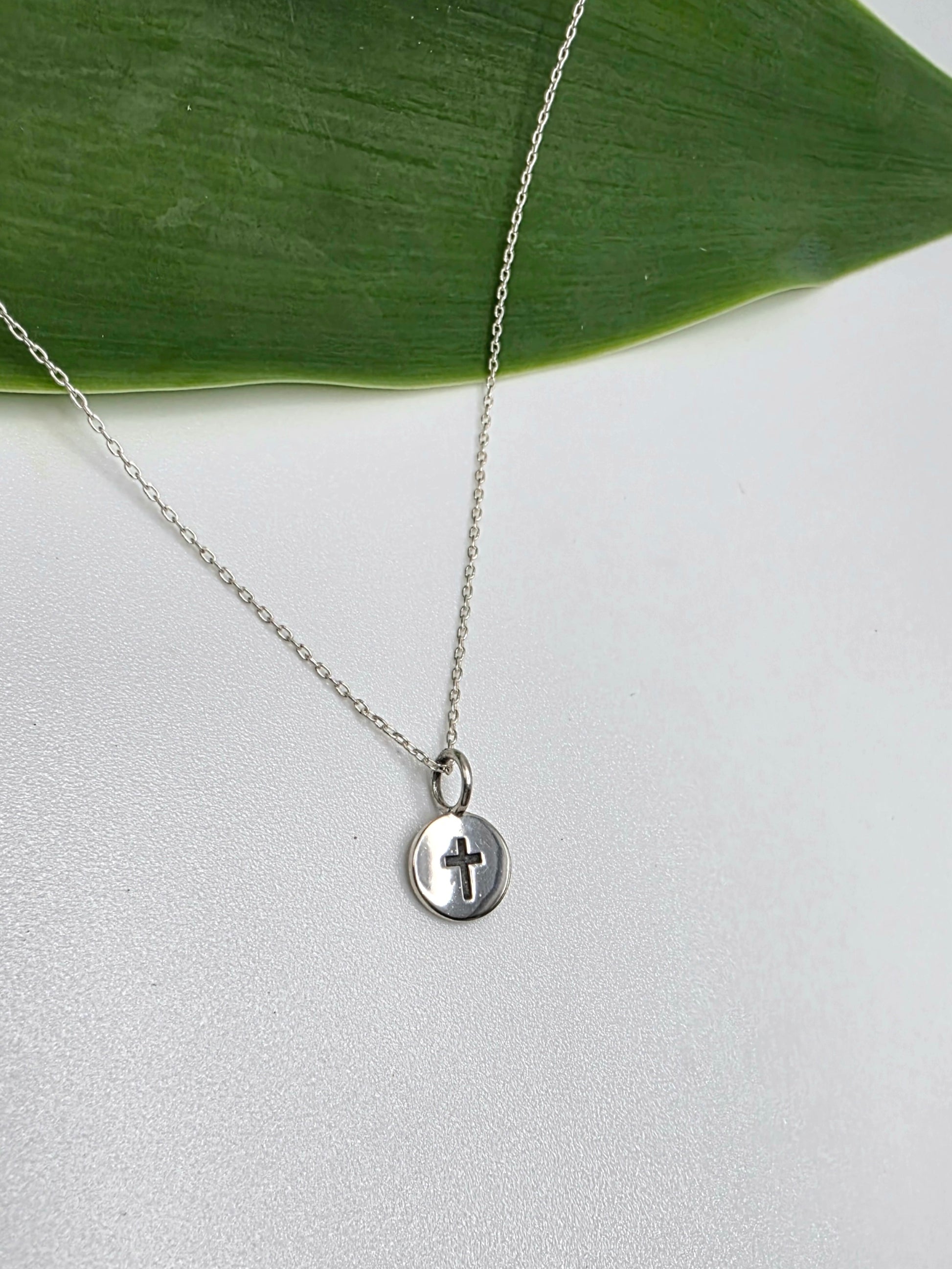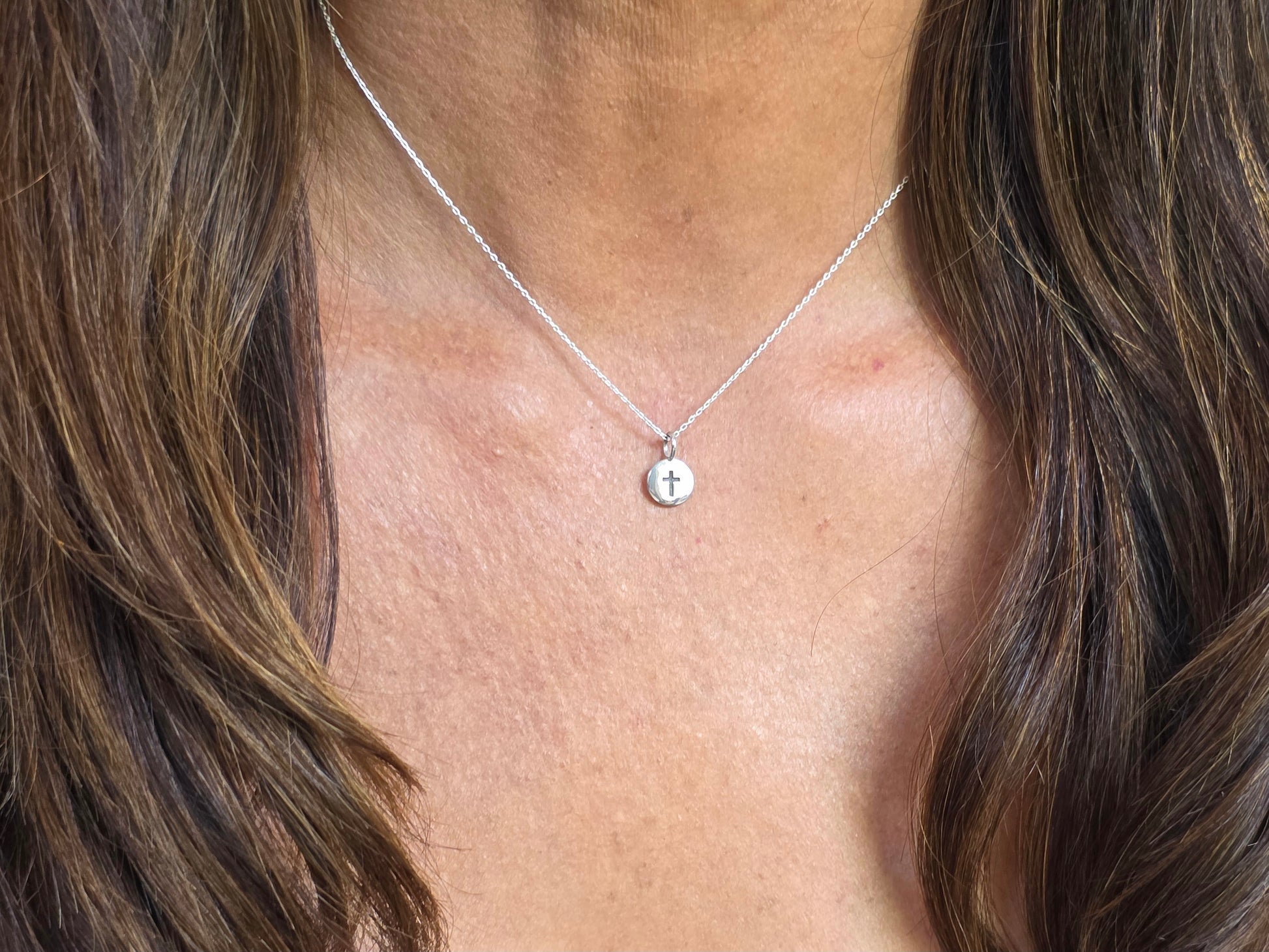 The Sterling silver, cross charm is a dainty 6mm across and 8mm tall with a shiny finish. It is 2mm thick and has a delicate Sterling Silver chain going through the top of the cross. Shown here in 16" length.